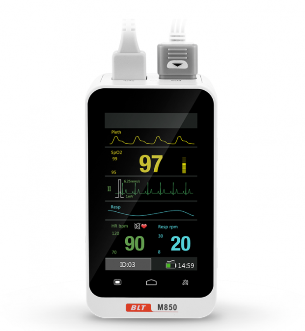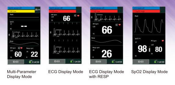 Parametri monitorati: ECG, RR (standard), SpO2, PR (opzionale).